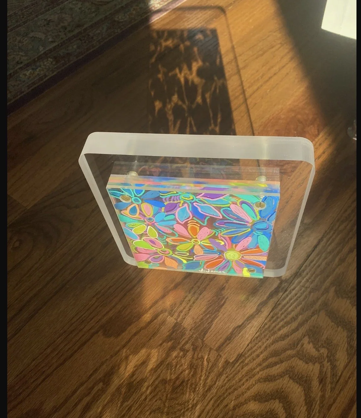 Reinventing the landscape. These paintings comprise five panels of transparent acrylic glass with ten layers of paint. The result is a 3D kinetic artwork that blends classic techniques with a modern aesthetic. The frame is crafted from a seamless, hand-sanded piece of transparent acrylic, allowing natural light to illuminate the painted layers.