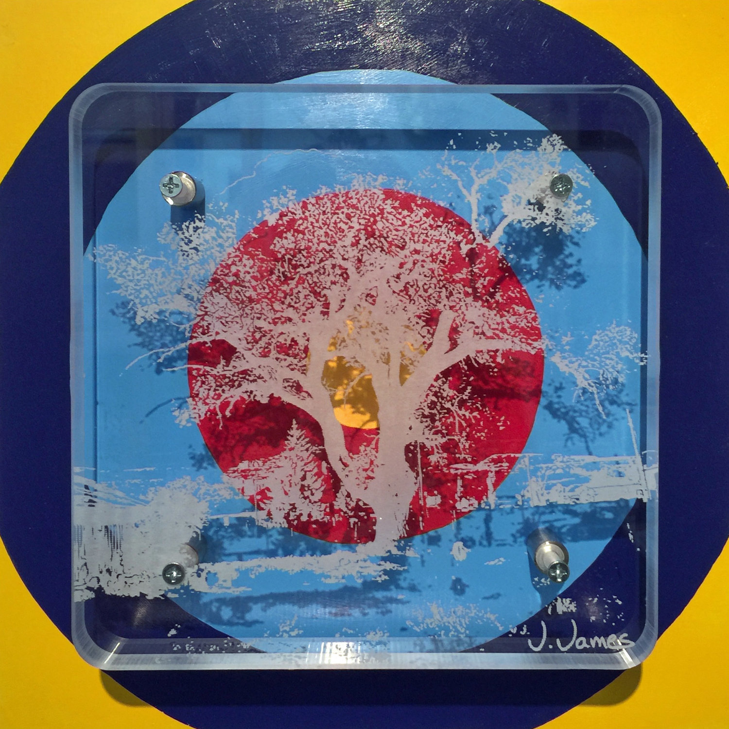 James is taking this technique further with a series focused on abstract impressionism both, on layered acrylic glass. As a multi-disciplinary artist she also works on panel and canvas.